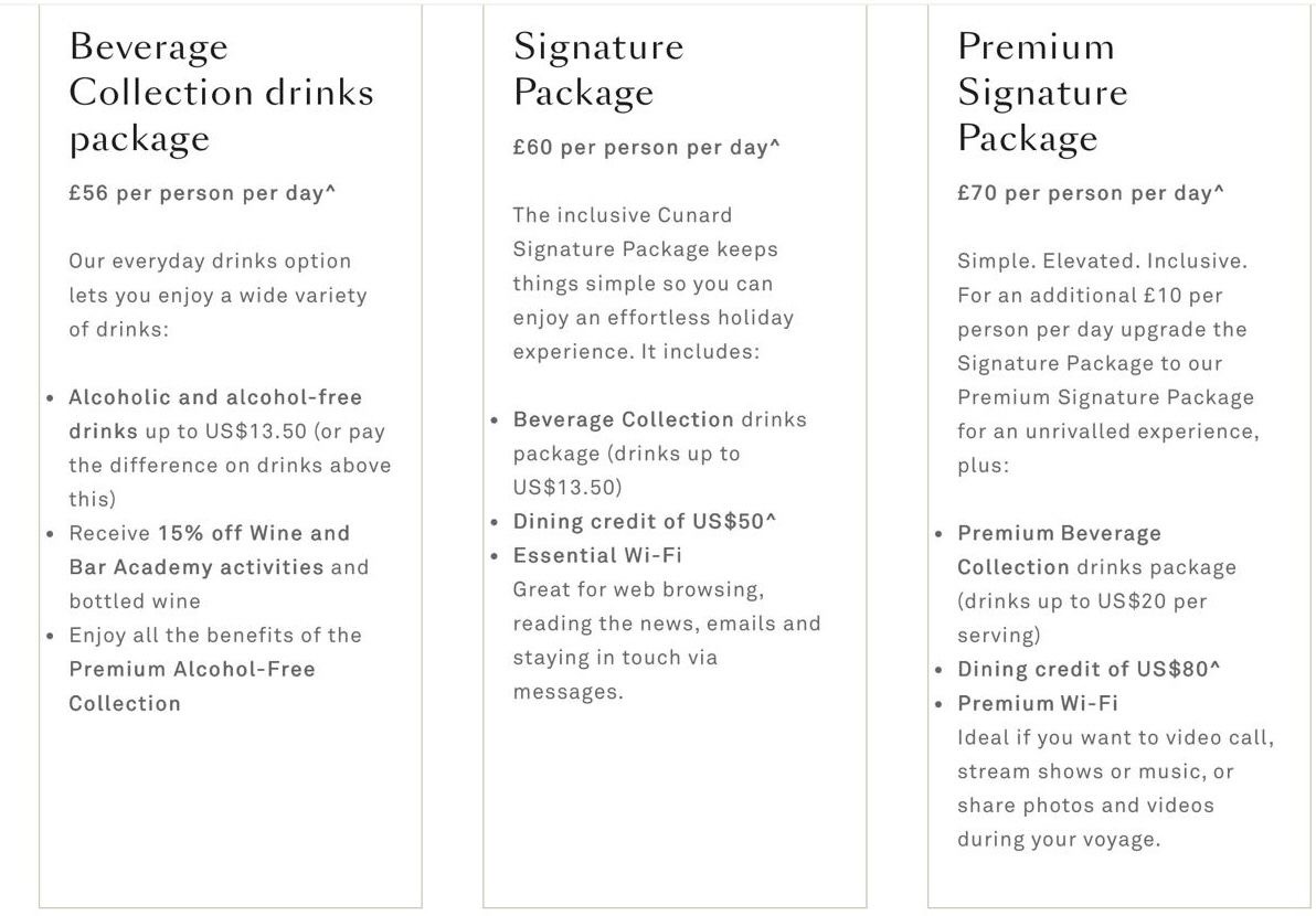 Cunard have recently changed all there drinks packages, you can now purchase a package for any length of voyage, all the new prices are listed below. Prices in Brackets are if you book onboard.